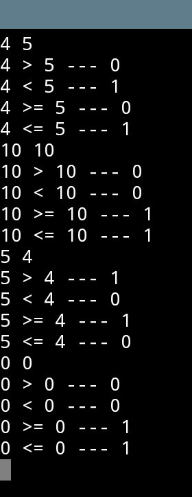 printf("%d >= %d --- %d\n", a, b, a>=b);