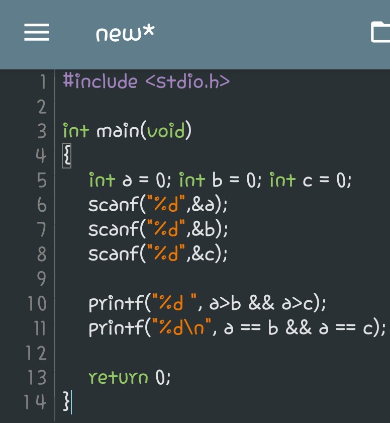 printf("%d ", a>b && a>c);