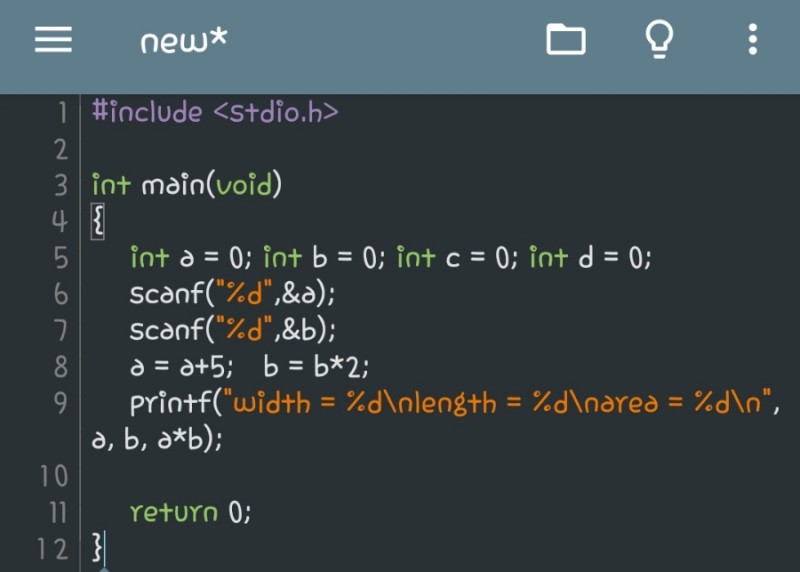 printf("width = %d\nlength = %d\narea = %d\n", a, b, a*b);