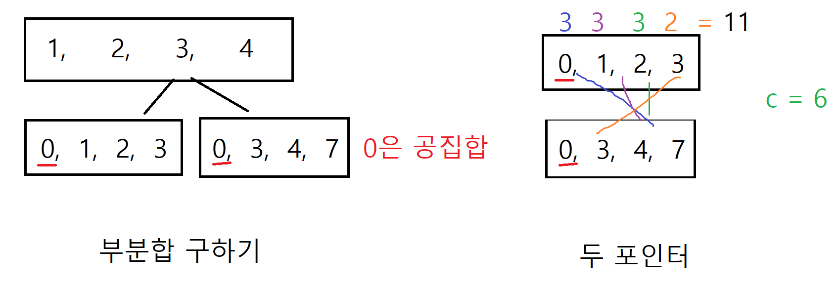 4.1 왼쪽, 오른쪽 부분수열의 부분합을 담은 배열로 구분하고, 왼쪽은 0번부터, 오른쪽은 마지막 부터 시작합니다.