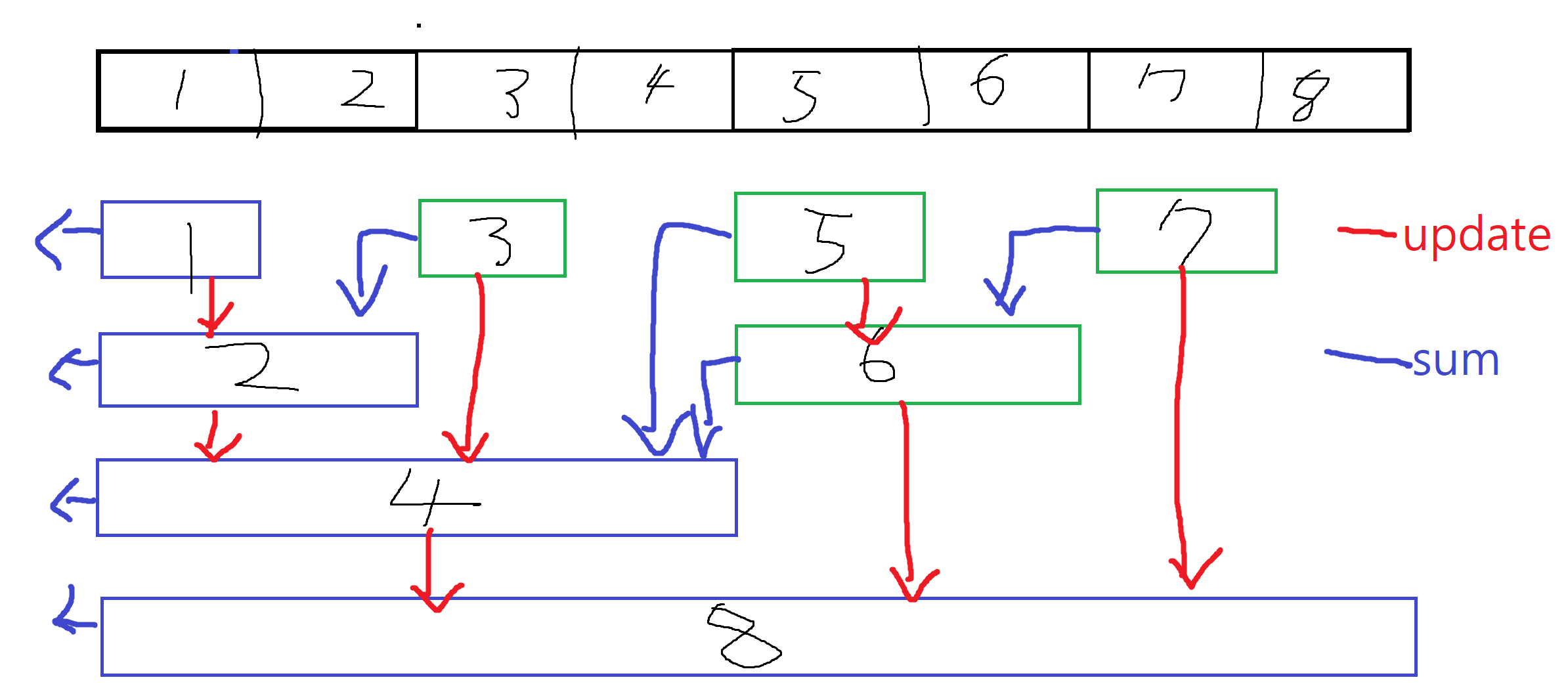 sum(7) = tree[7] + tree[6] + tree[4] = arr[7] + arr[6] + arr[5] + arr[4] + arr[3] + arr[1] + arr[2]