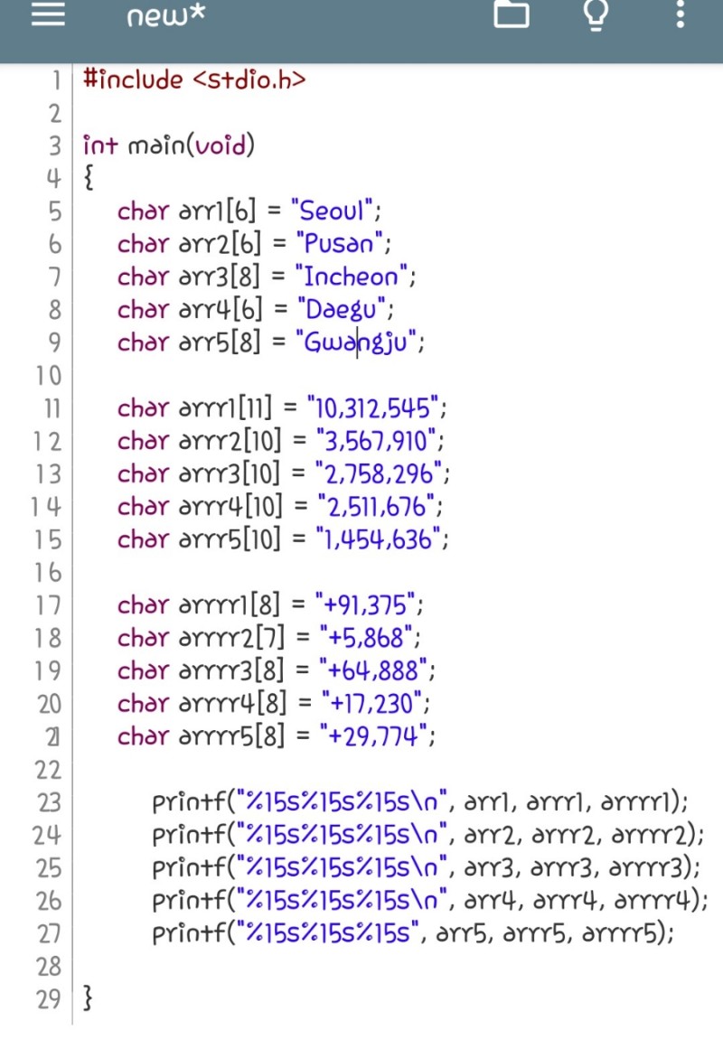 계속해서 원인을 생각해보니 문자열마다 크기(byte)가 다른 것이 이유로 생각했고 이를 위해 공간을 할당하기 위해선 무언가를 해야 하는데 이쪽 개념이 어려워서 그냥 하나하나 문자열마다 배열을 만들어준 다음 일일이 출력하는 형식으로 만들었다.