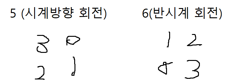 5. 주의할 점은 회전상태가 90도, 270도 인 경우, 좌우반전은 처음 0도 인 상태에서 상하반전과 같고, 상하반전은 처음 0도인 상태에서 좌우 반전과 같습니다. 즉 90도, 270도 라면 1을 하라 하면 2을 하는 것과 같고, 2을 하라하면 1을 하는 것과 같습니다.