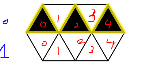 2. 짝수번의 삼각형 아래 (파란색 0번줄 기준, 파란색 1번줄 기준은 위), 왼쪽 오른쪽에 검은색 삼각형이 있는지를 확인하고, 접하고 있는 검은 삼각형의 개수 만큼 노란색 모서리의 총합 에서 1씩 감소 시킵니다.