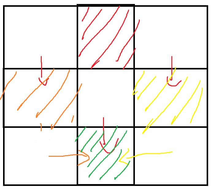 2) n*m 이 홀수인 경우 : (1,2) 부터 시작해야 ⌊(n*m)/2⌋ 만 에 집는것이 가능합니다. 이또한 +2씩 오른쪽으로 이동하며, 범영역을 침범하면 아래로 내려갑니다. (2,2)가 아니라 (2,1)로 시작합니다. 다시 내려가면 (3,2)로 시작합니다. ...이를 반복합니다.