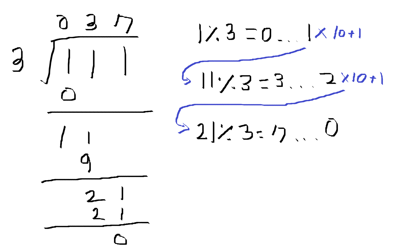 오른쪽의 나머지가 0이 될 때까지, (3으로 나누고, 나머지에 10을 곱한 후 1을 더하기) 이 과정을 거친 것과 같다는 것을 알 수 있습니다.